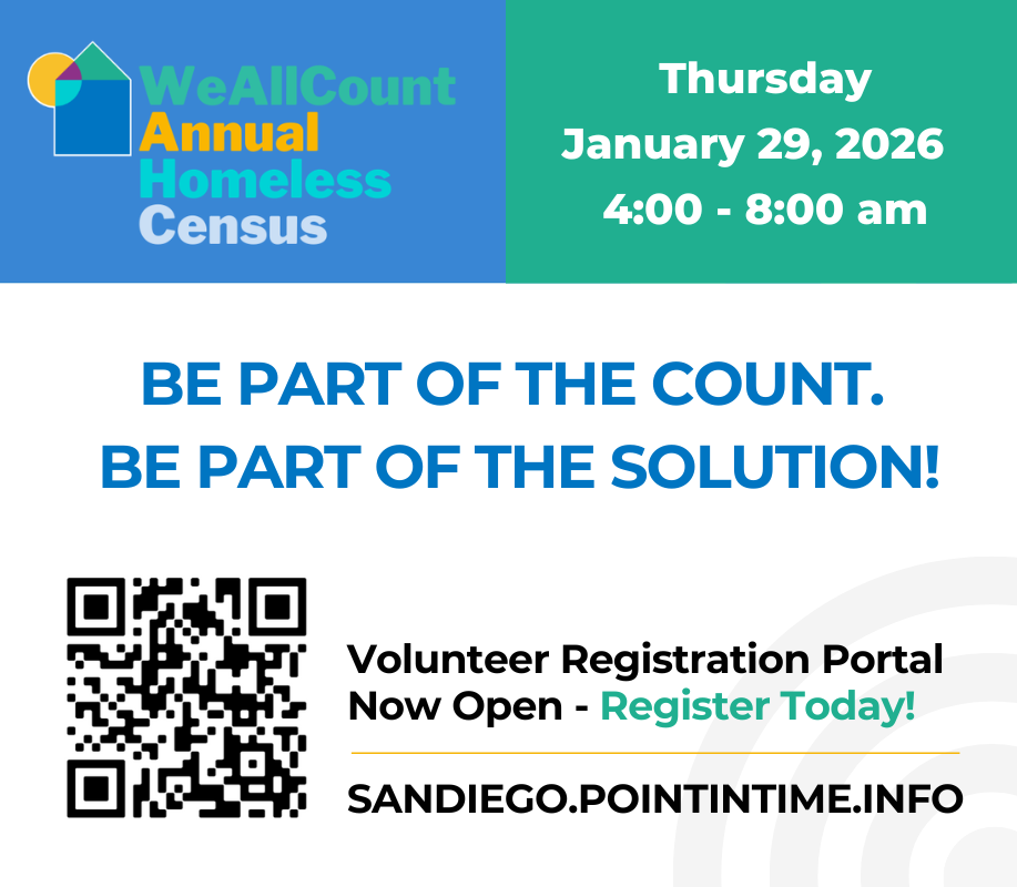 Be a hero for your community. On the morning of January 29, 2026, join approximately 1,700 volunteers for the annual Point-in-Time (PIT) WeAllCount across San Diego County. As a volunteer, you’ll help conduct a brief survey and headcount with individuals experiencing unsheltered homelessness — ensuring their experiences are counted, their voices are heard, and their needs are better understood. When we show up together, we can make a real difference.