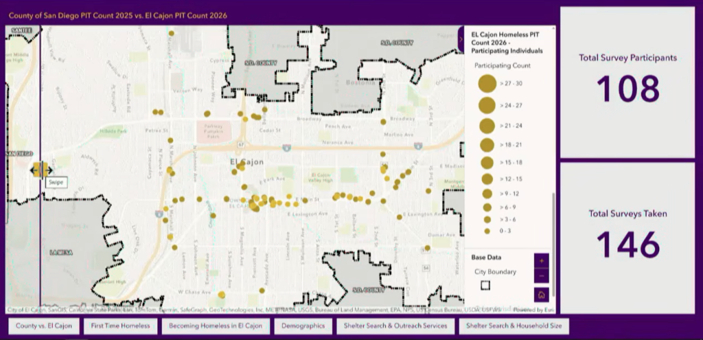Diaz said the Jan. 22 count identified 146 unsheltered individuals within El Cajon. The 2025 RTFH count identified 344 unsheltered people in the broader El Cajon area, including roughly two dozen outside city limits. Results from the 2026 regional count have not yet been released.