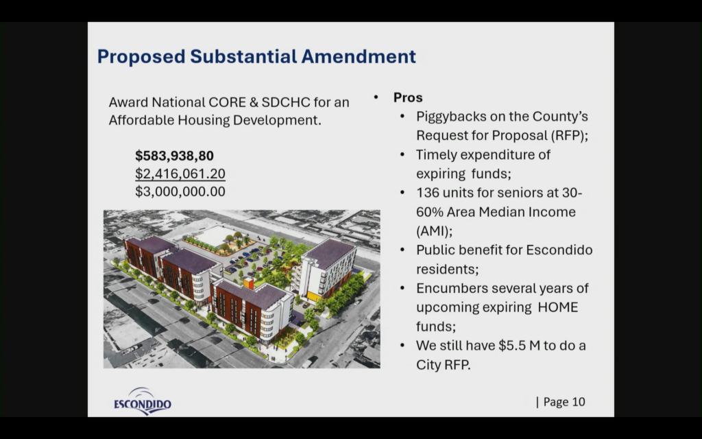 ESCONDIDO – A proposed affordable housing development aimed at low-income seniors — including those experiencing or at risk of homelessness — moved forward this week with City Council approval of key funding.